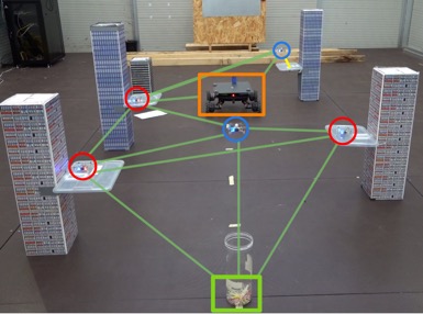 The team of UAVs is also required to locate and identify an unknown number of CBRNe threats, which are simulated with ArUco markers, and to report the location of the threat to the base. While searching, the battery of each UAV is draining and each UAV can go back to the base to recharge, or land on available spots, which are also marked with ArUco markers. There are also decoy markers that do not denote nor CBRNe threat nor landing spot. When going back to the base, or landing, the system needs to remain connected even with one or more UAVs charging or grounded on landing spots. Each UAV can recharge only once but it is allowed to land multiple times on landing spots. The mission ends when the connection of the ground vehicle to the base is lost completely.